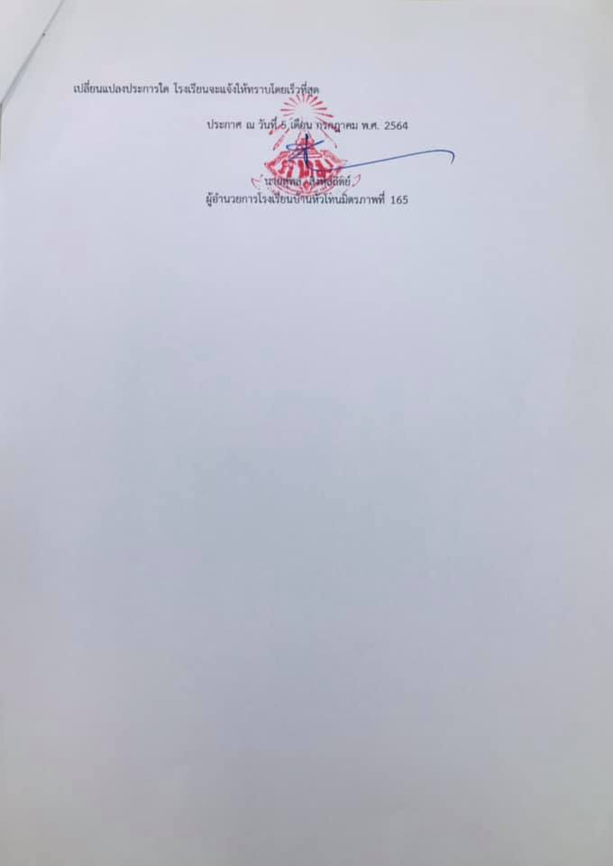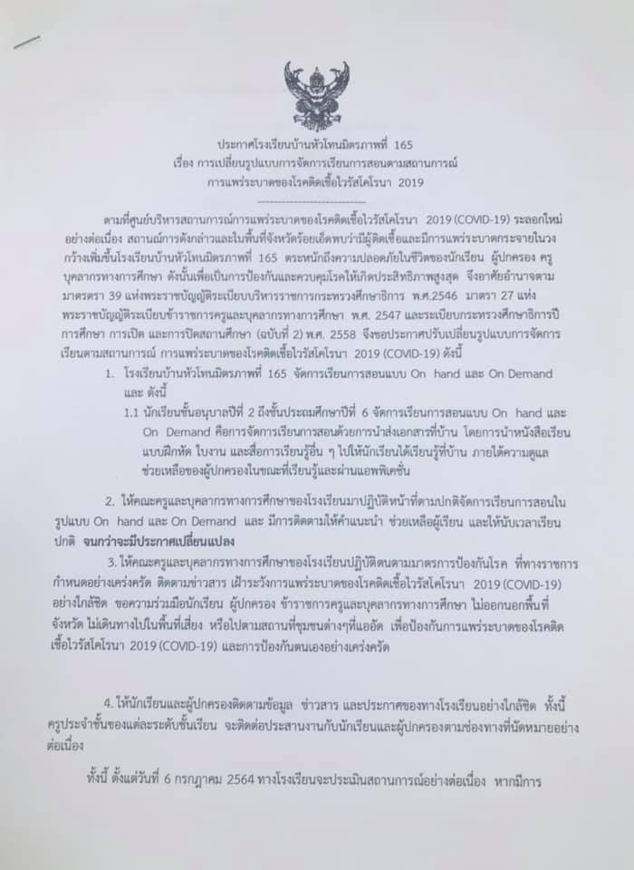 ประกาศจากโรงเรียน มีการเปลี่ยนแปลงรูปแบบการจัดการเรียนการสอนตามสถานการณ์การแพร่ระบาดของเชื้อไวรัสโคโรนา 2019